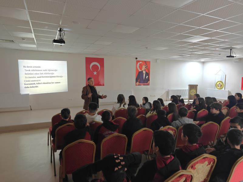 Fakültemiz Kanatlı Hayvan Yetiştiriciliği Bölümü öğretim üyesi Prof. Dr. Mustafa MİDİLLİ, “Görünmeyen Düşman: Tavuk Eti Zehirlenmesi ve Korunma Yolları” başlıklı sunumuyla; Okul Müdürü Ahmet TOPAL, Biyoloji Öğretmeni Bekir GENÇER ve öğrencilerle bir araya gelerek gıda güvenliği konusunda bilgilendirmelerde bulundu.