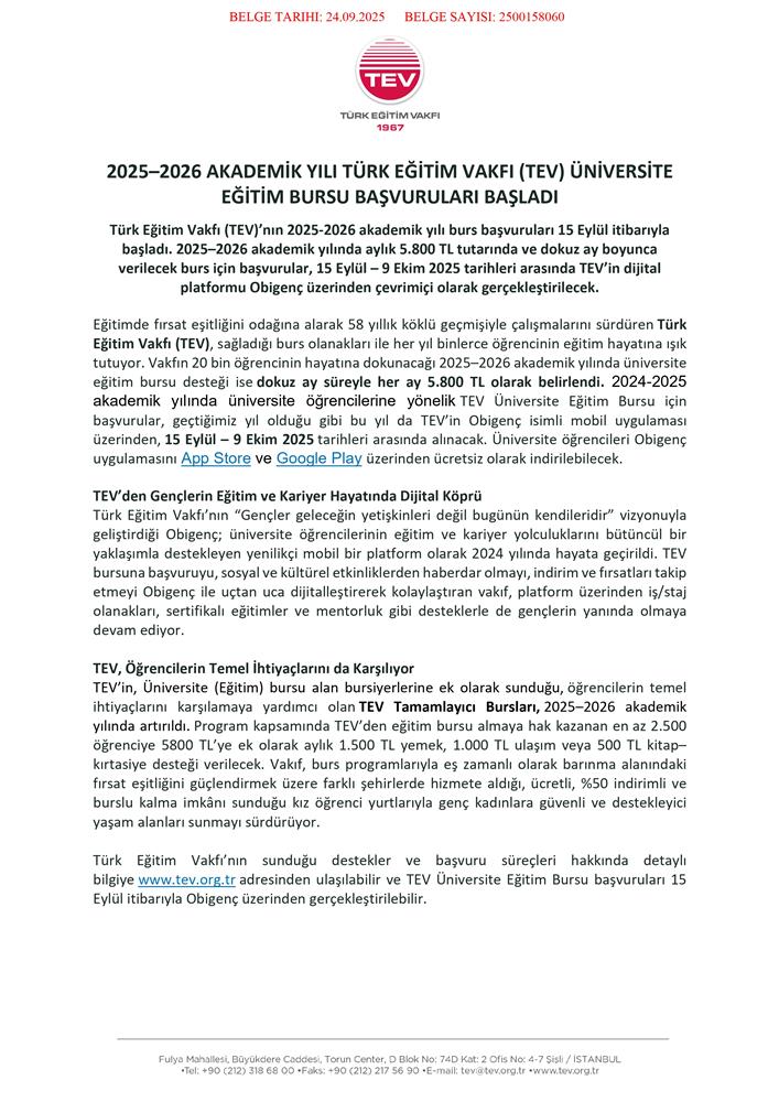 2025-2026 Öğretim Yılı “TEV Üniversite Eğitim Bursu” Başvuruları