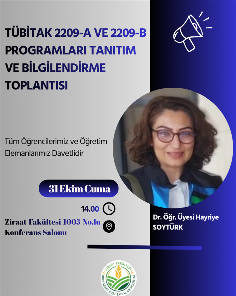 Bolu Abant İzzet Baysal Üniversitesi Ziraat Fakültesi tarafından, TÜBİTAK 2209-A Üniversite Öğrencileri Araştırma Projeleri Destekleme Programı ile 2209-B Üniversite Öğrencileri Sanayiye Yönelik Araştırma Projeleri Desteği Programı hakkında bilgilendirme toplantısı düzenlenecektir.